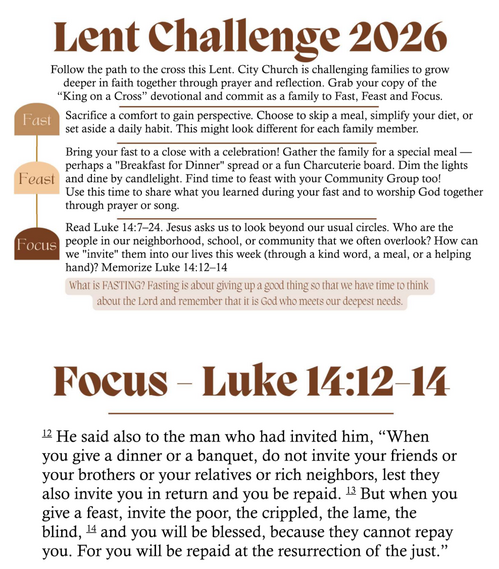 Follow Along with The Gospel Story Bible and the at-home family Devotionals Long Story Short and Old Story New by Marty Machowski (purchase online or contact Maire Schultz to purchase a copy at City Church at a discount). This resource is designed to track exactly with our Sunday School curriculum, so we're always on the same page!