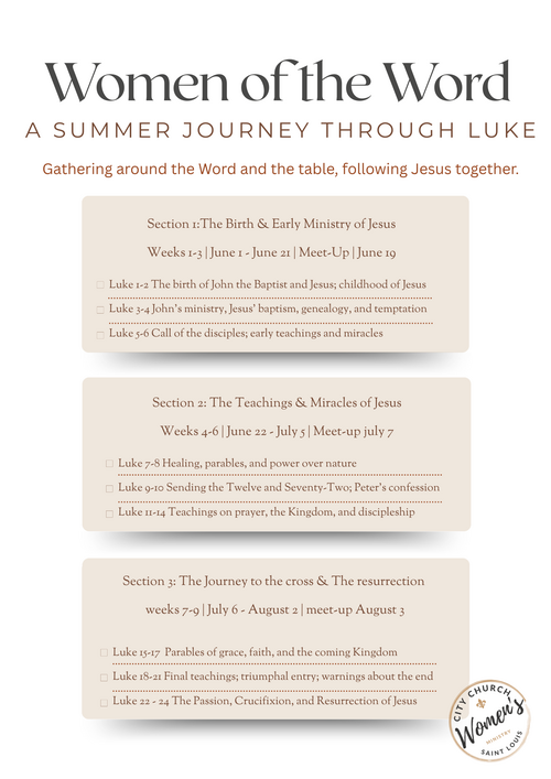 Ladies, you’re invited to join Women of the Word: A Summer in Luke, a 9-week Bible reading challenge beginning June 1. As our entire church continues through the Gospel of Luke in our sermon series, the women’s ministry is diving in together—with the goal of growing closer to Jesus, deeper in His Word, and stronger in community.